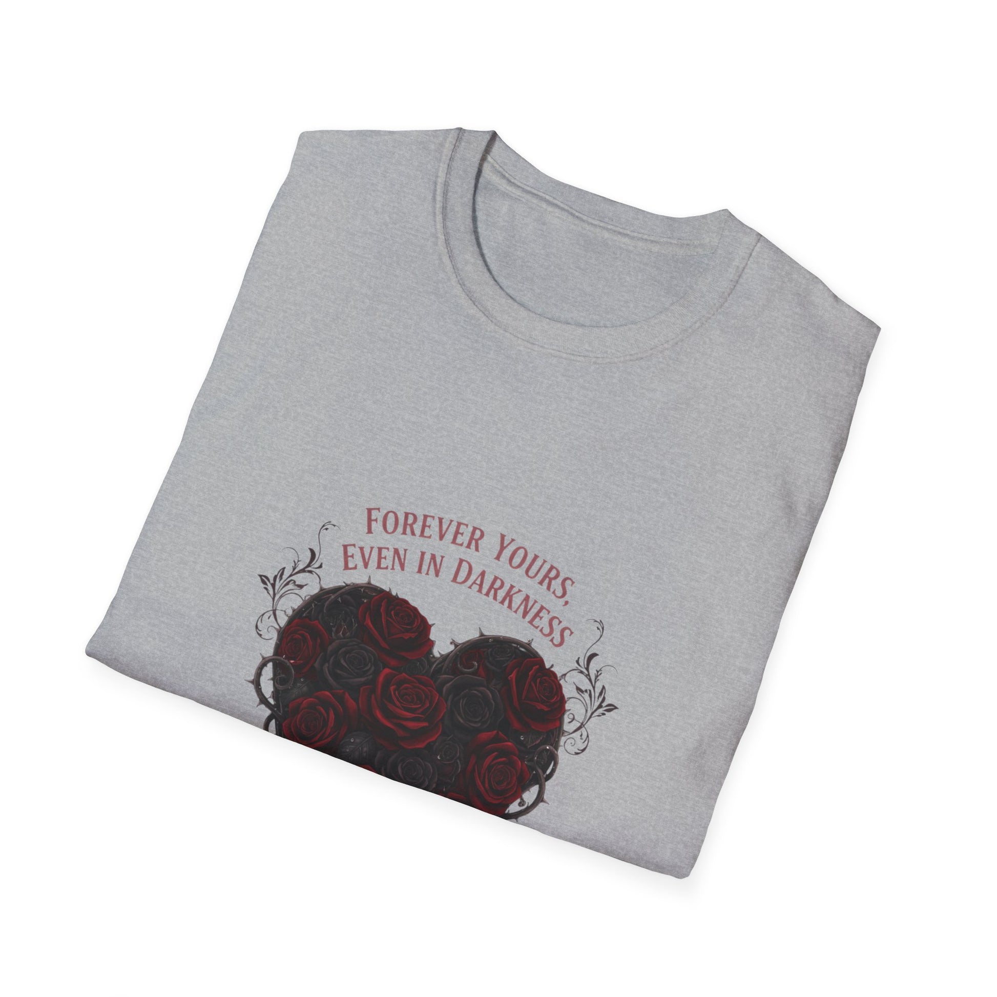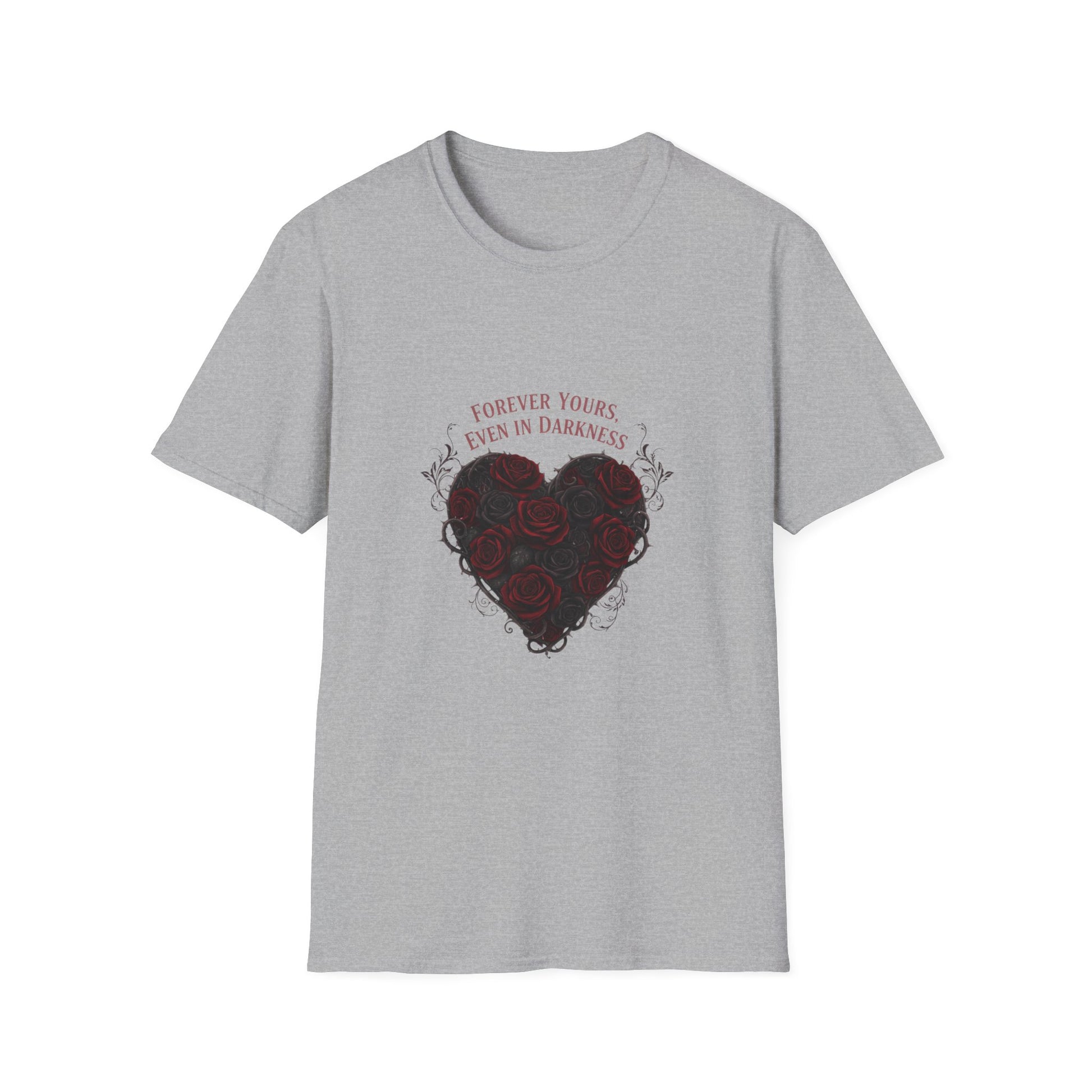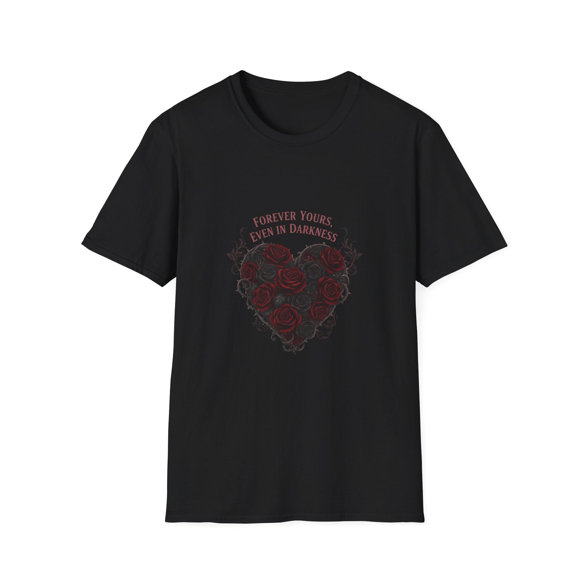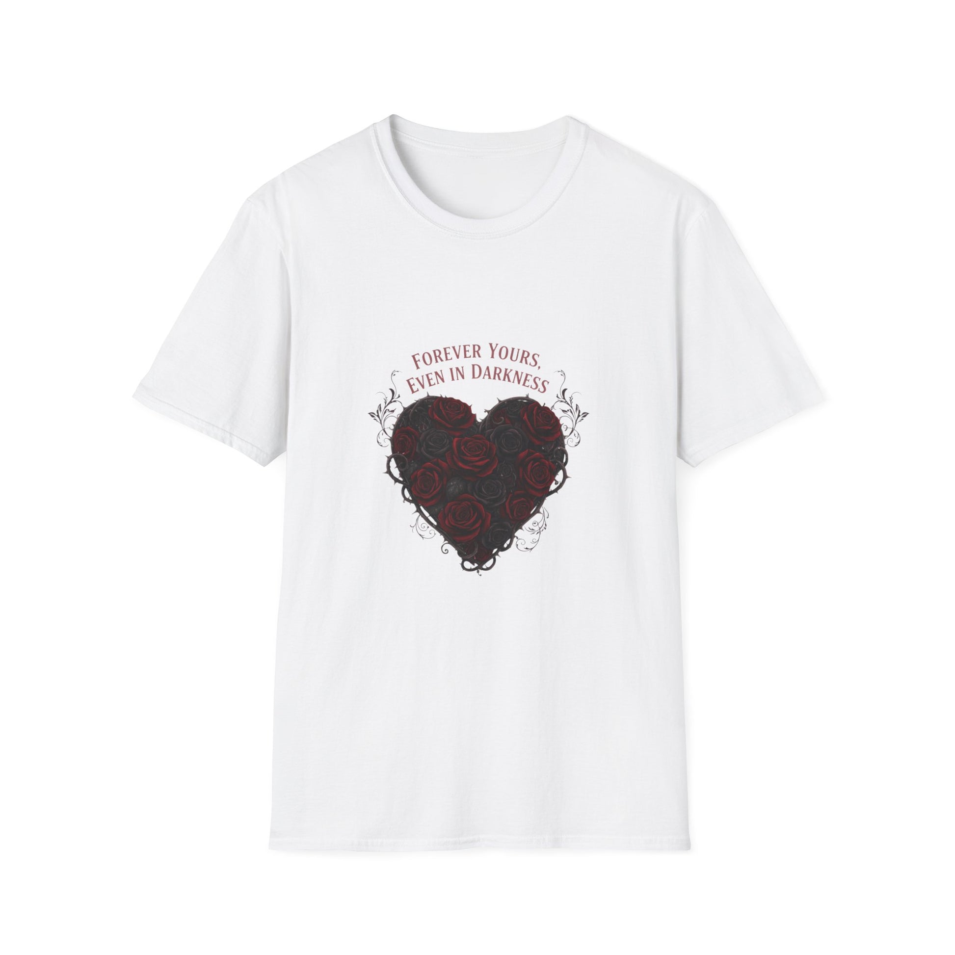 A brooding, artful tee that reframes Valentine motifs in a dark-romance palette. The front artwork centers a heart-shaped cluster of deep burgundy roses entwined with thorny vines and a subtle classical serif line above reading a bittersweet vow. High-contrast, vignette-style composition and anatomical-floral details give the design a moody, gothic-valentine feel suited to romantasy and emo-love aesthetics.